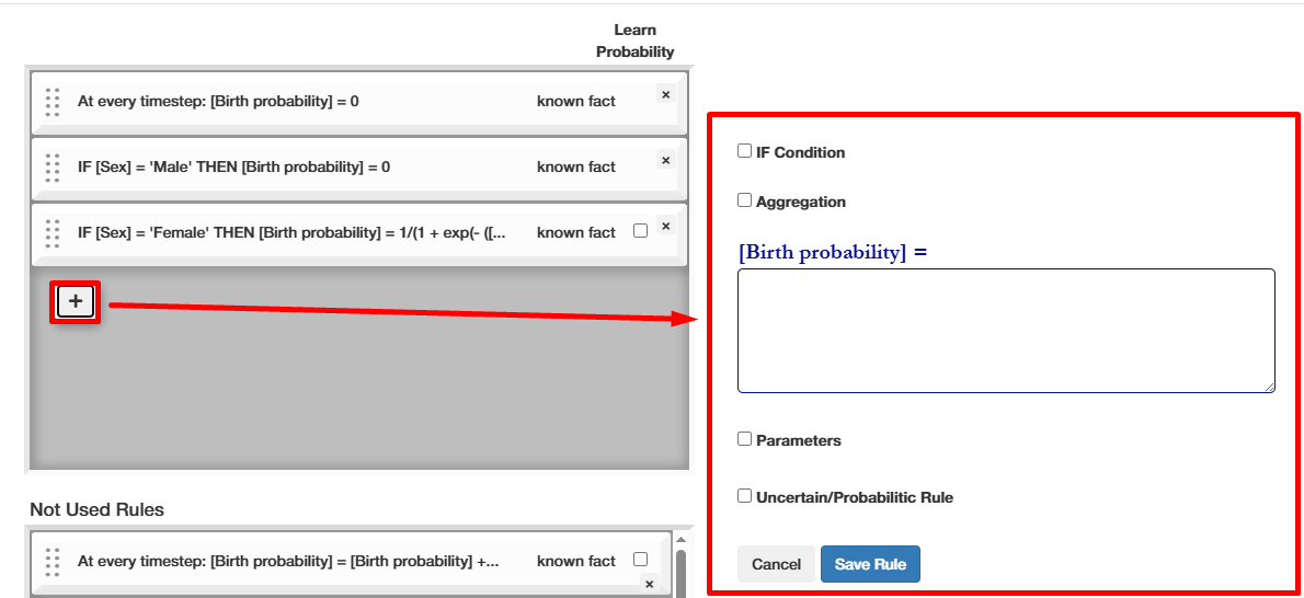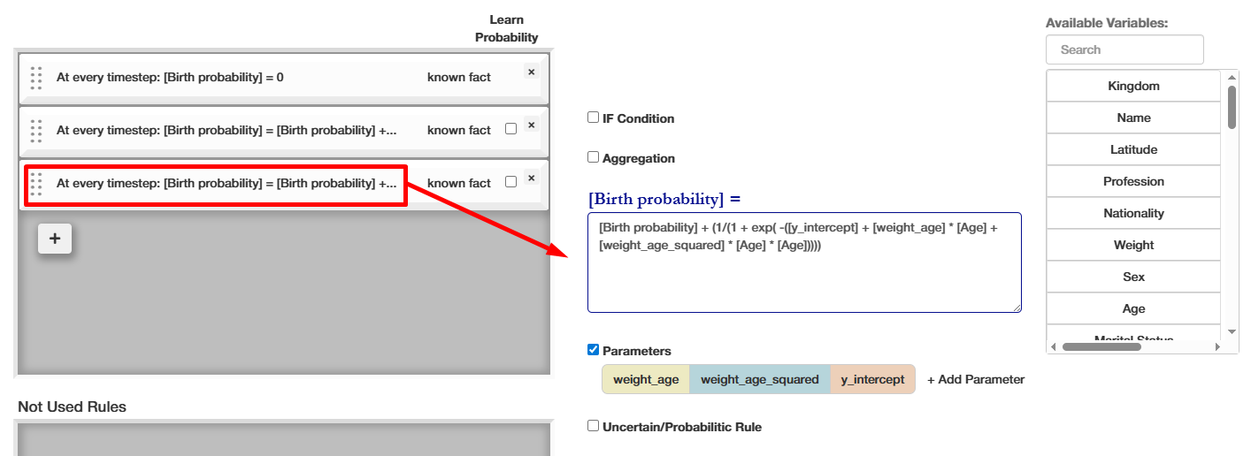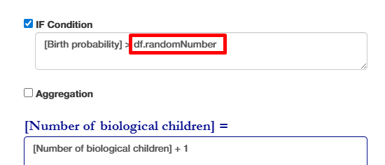 This allows for random values anywhere in the rule - see example below. The number is drawn from a uniform distribution between 0 and 1. This allows variables such as a country's "Average fertility rate" to be calculated as aggregated value from many people/population groups.