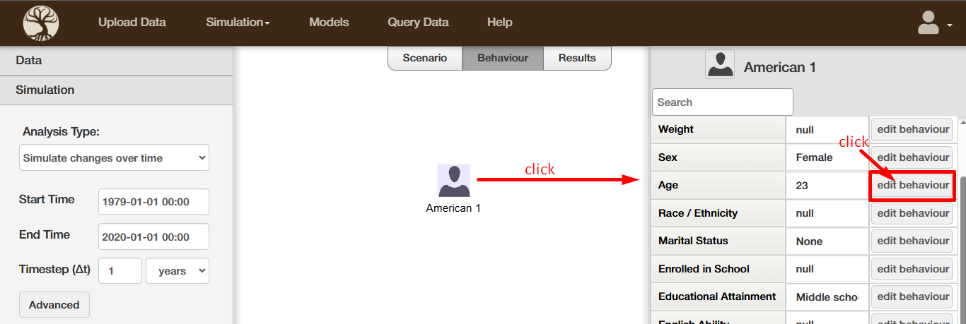 Behavior rules calculate the next timestep's value for a variable, using any of the current actor's own attributes or attributes of an agent related to the current actor.