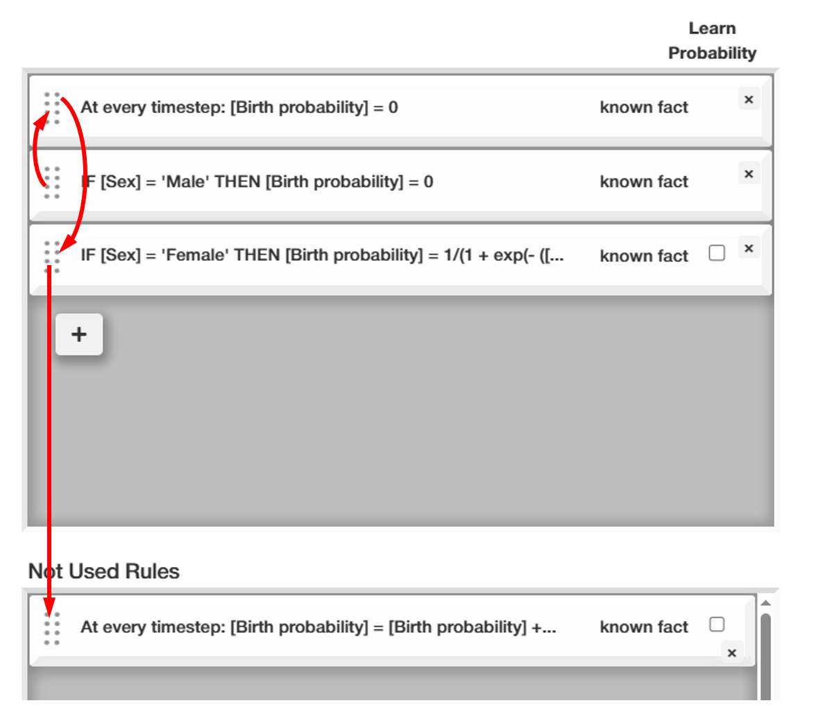 During the simulation, rules are executed after each other from top to bottom. By drag&dropping them, you can change the execution order or completely remove them from the next run.