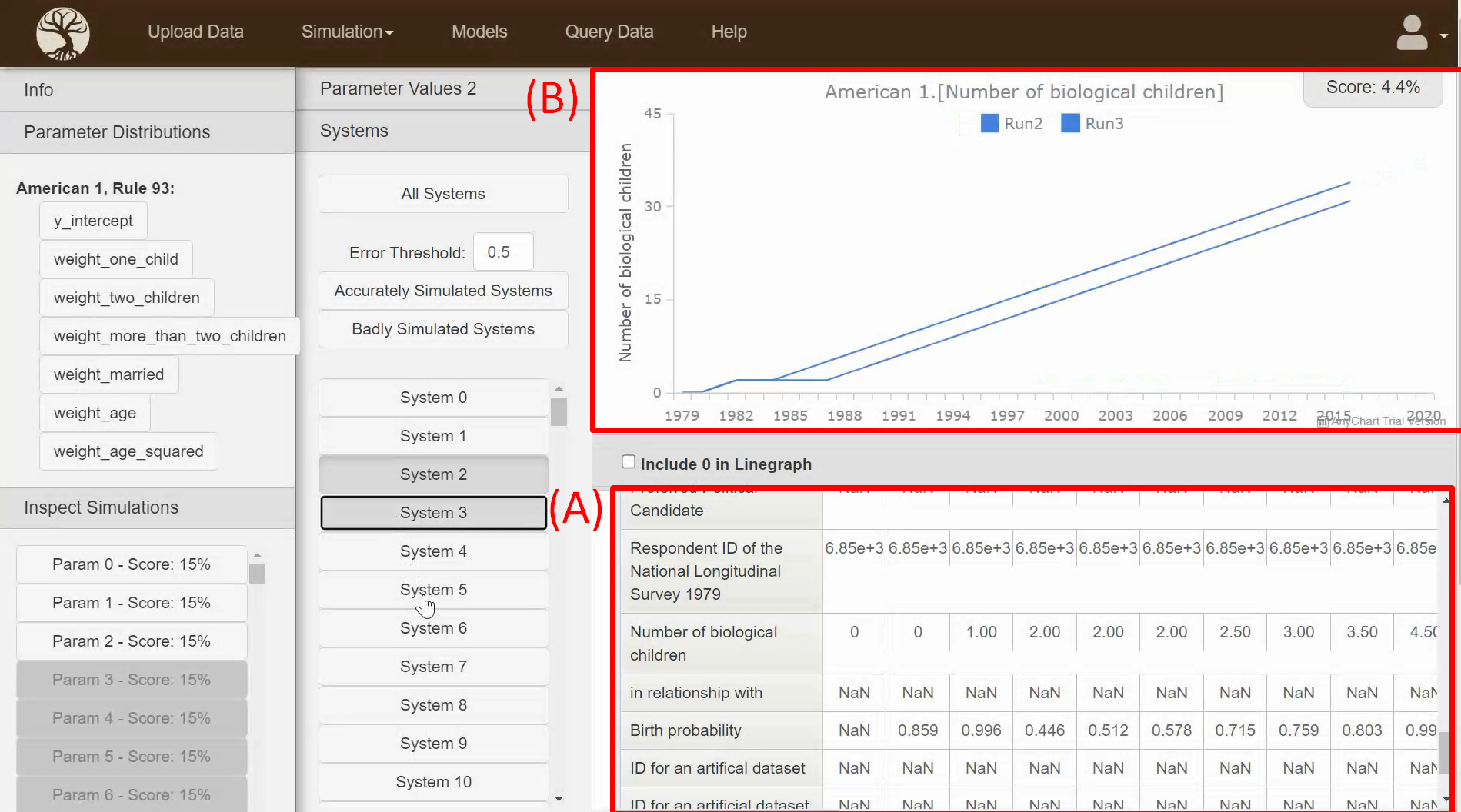 - Graph to show the evolution of an attribute. It can also show this attribute evolution for many simulations simultaneously - allowing for comparisons and trend analysis