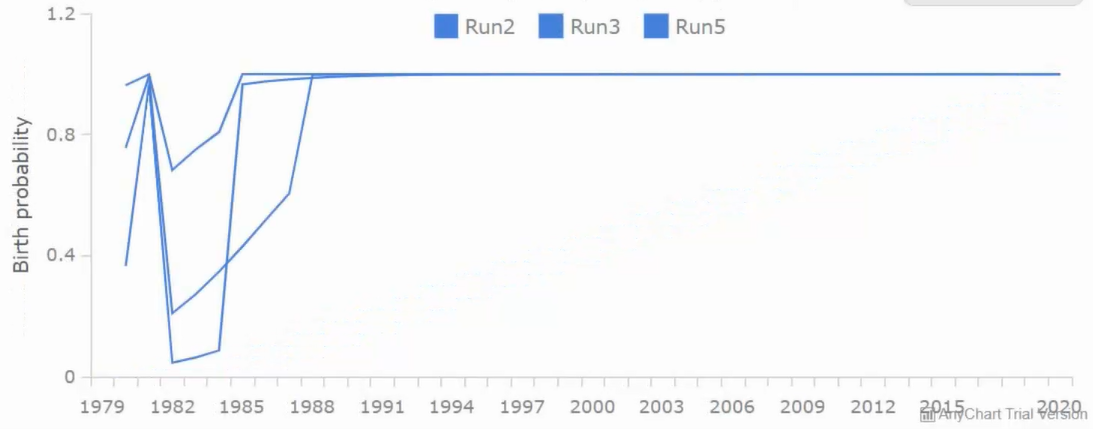 In the above example, [Birth probability] is a value between 0 and 1 that gives the probability of a woman to give birth this year.Let's say, that the [Birth probability] is 0.05 (i.e. a 5% chance to give birth this year).