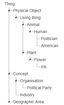 An object (e.g. Adam Smith) is an instanciation of an object type (here: human). The object type human inherits all properties from its parent object types, which are [object -> living thing -> animal -> mamal] as well as [concept -> legal entity].
